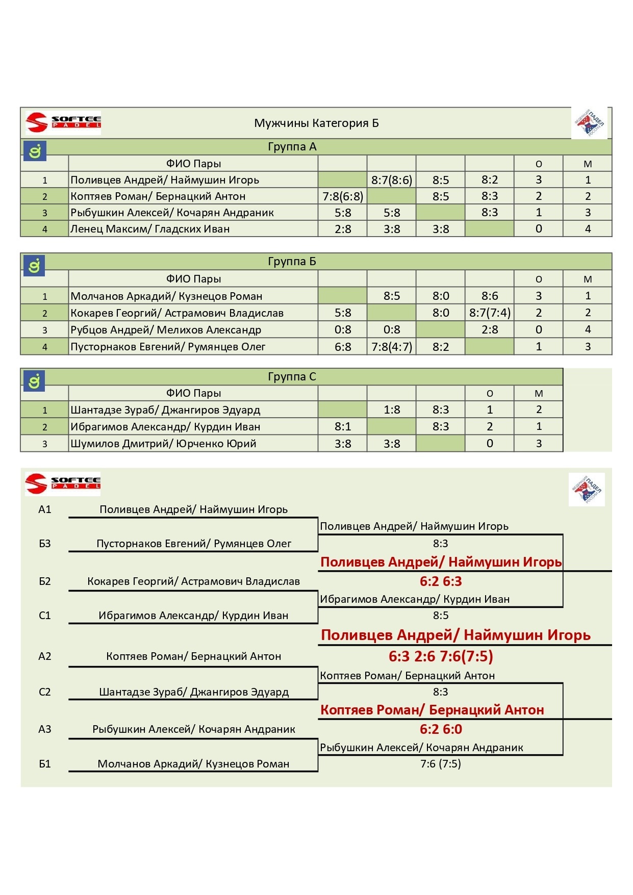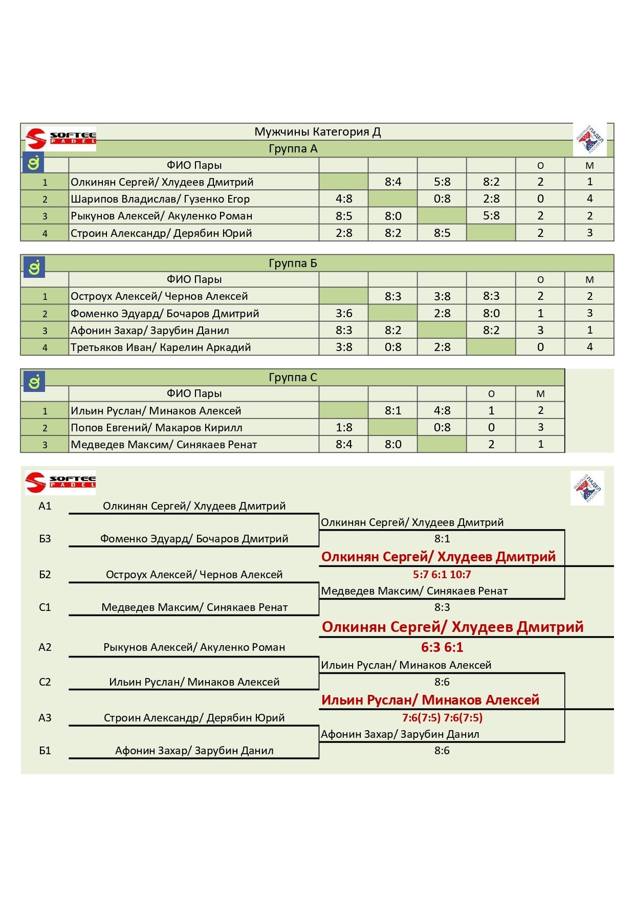 Группы играются из 1 Про сета ( до 8 геймов) с розыгрышем решающего очка по счете 40/40 и при счете 7:7 играется Тай Брейк.